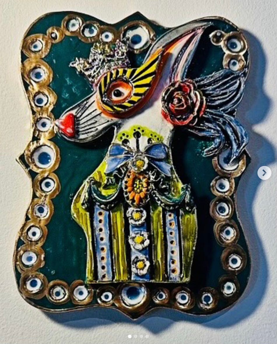 Mystic Treasures is Chaice Garner’s first solo exhibition, currently on display at Echo Contemporary Art. Her collection of ceramic pieces blend folklore, symbolism, and animal imagery with color and intricate details to tell stories about the seen and unseen. I’m looking forward to spotting symbols that have frequently appeared throughout time and place, like the blue eyes (reminds me of evil eye pendants), and the rabbit shown in the above photo (reminds me of childhood fables and the hidden meanings of Playboy).