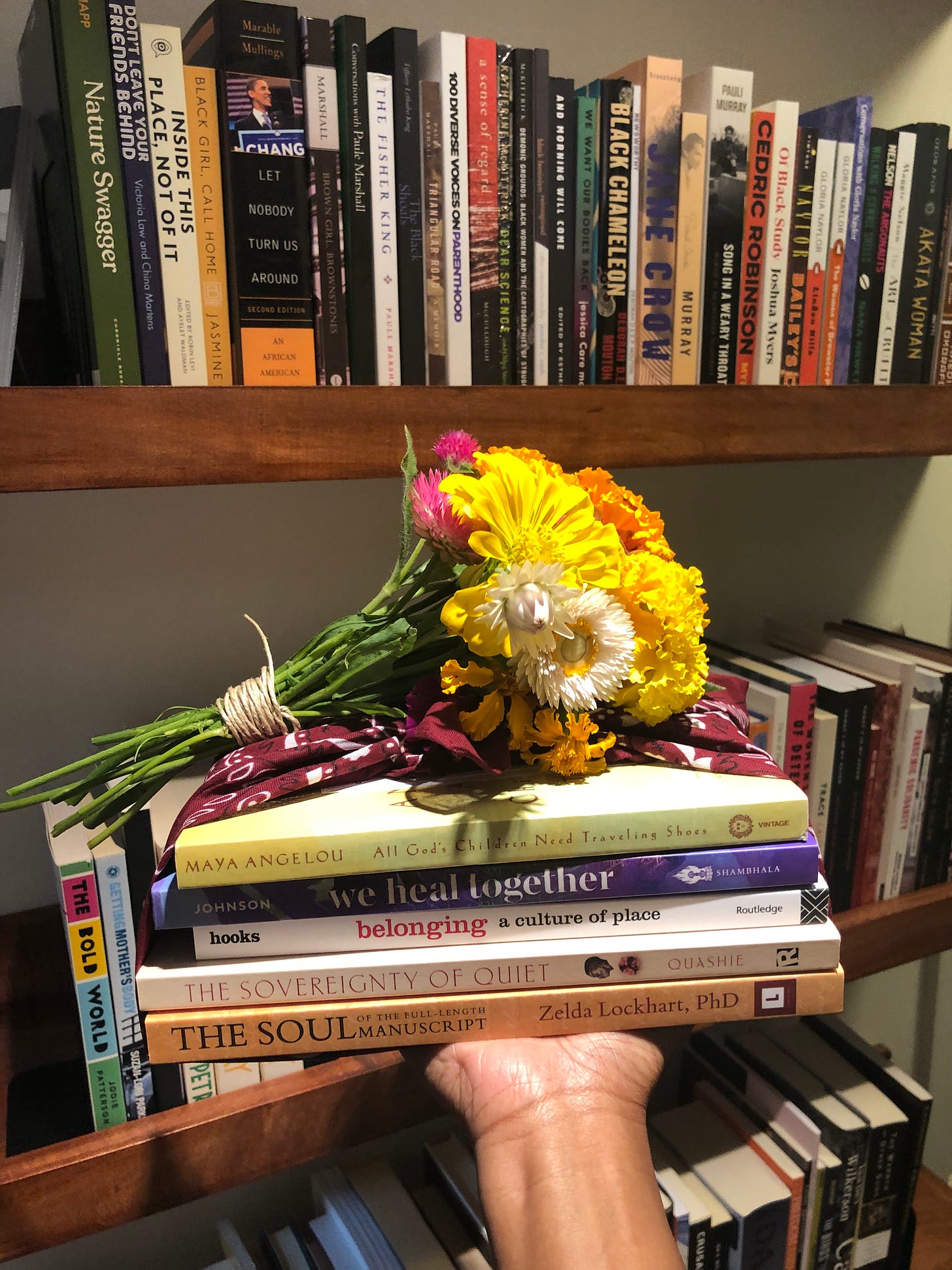 After twenty-seven years of engaging with books, my personal library tells all my business if you look closely. There are womanist texts, childhood favorites, self-helps, Christian books sitting next to juju manuals, a Toni Morrison collection with custom covers, and my prized stack of bell hooks titles that I keep stacked with a little vase of fresh flowers on top.